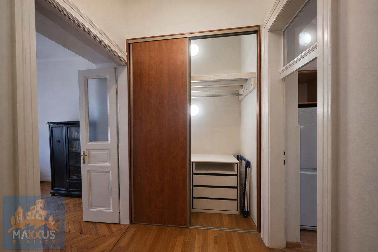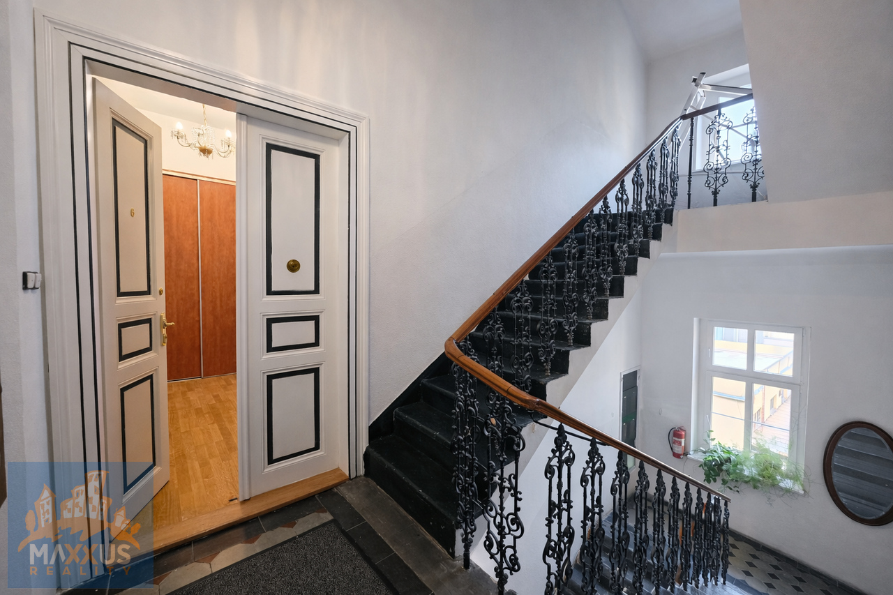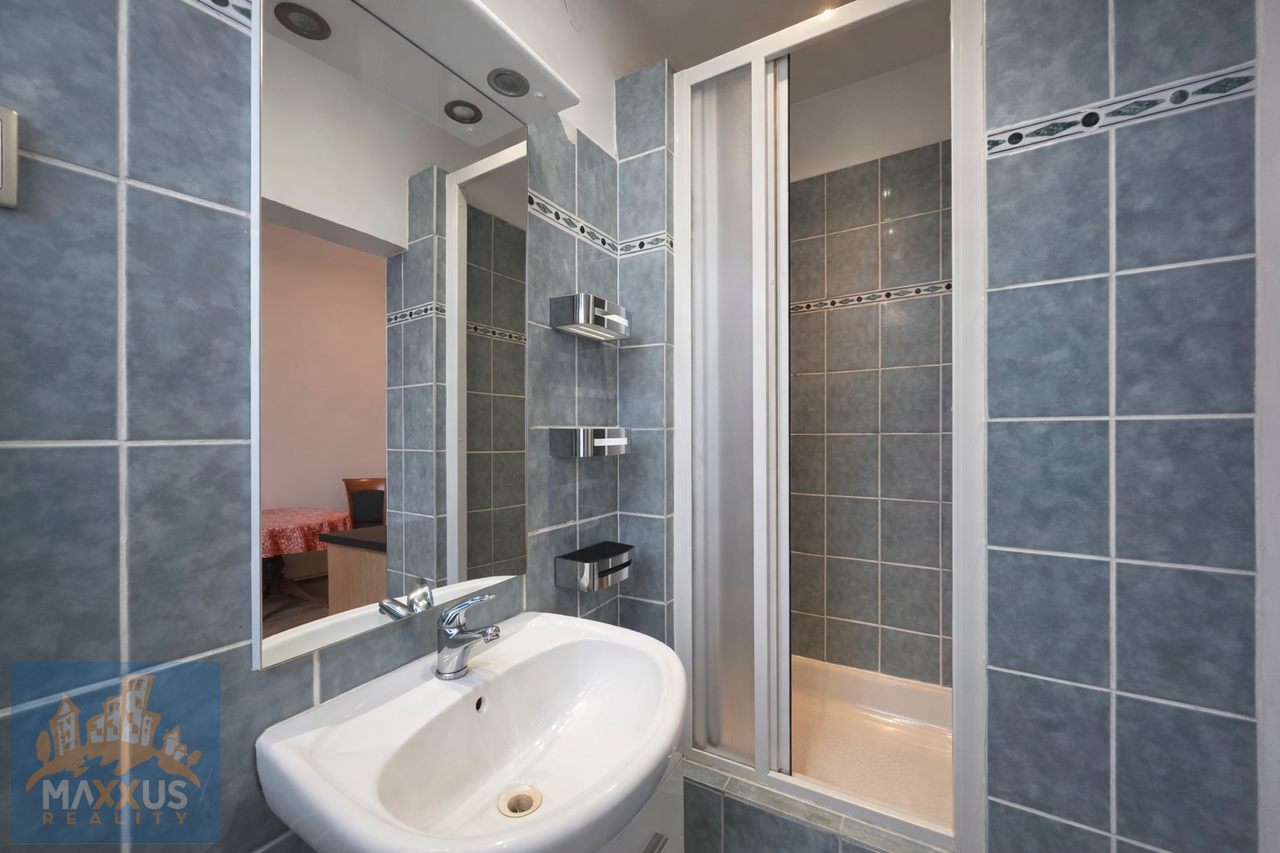 Byt disponuje koupelnou se sprchovým koutem a samostatným WC. Společné prostory domu mají zachované historické prvky, které dodávají místu osobitý charakter.