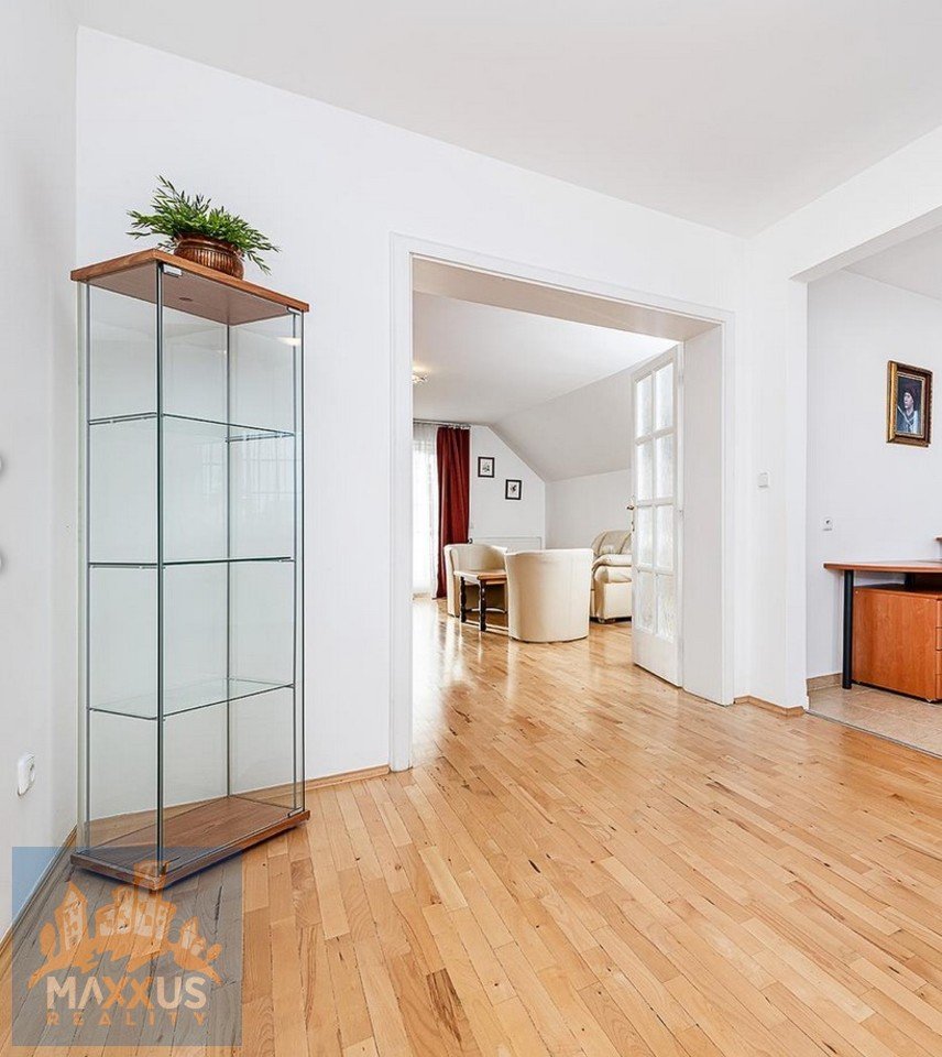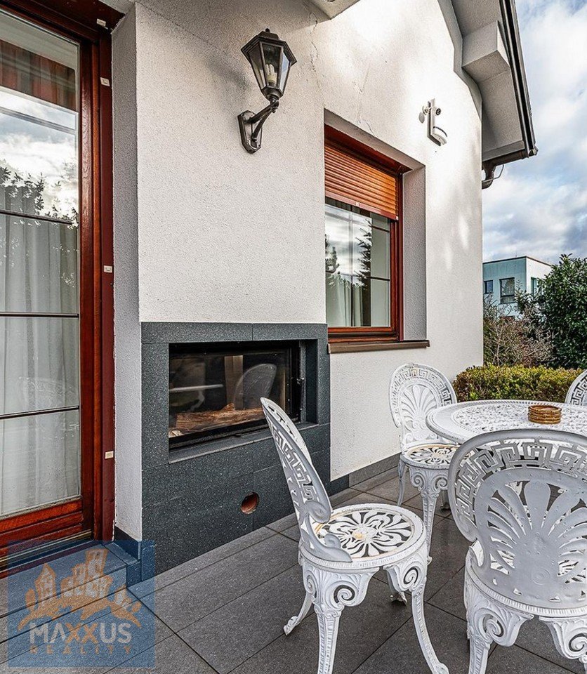 The ground floor features an entryway, a spacious living room with a fireplace and a dining area with access to the terrace and garden with a pool, a separate kitchen, two bedrooms, a bathroom with a bathtub and two sinks, a separate toilet, and a utility room. The upper floor of the house features a second living room or game room with access to a balcony, two bedrooms, a work area, and a bathroom with a shower and toilet. The basement offers plenty of storage space, a toilet, a shower, and a garage. Apartment amenities: kitchen cabinets (including a refrigerator with freezer, glass-ceramic cooktop, range hood, dishwasher, and electric oven), built-in wardrobes, central vacuum system, electric blinds, underfloor heating, washer and dryer, high-speed internet connection, hardwood floors, and tile flooring.