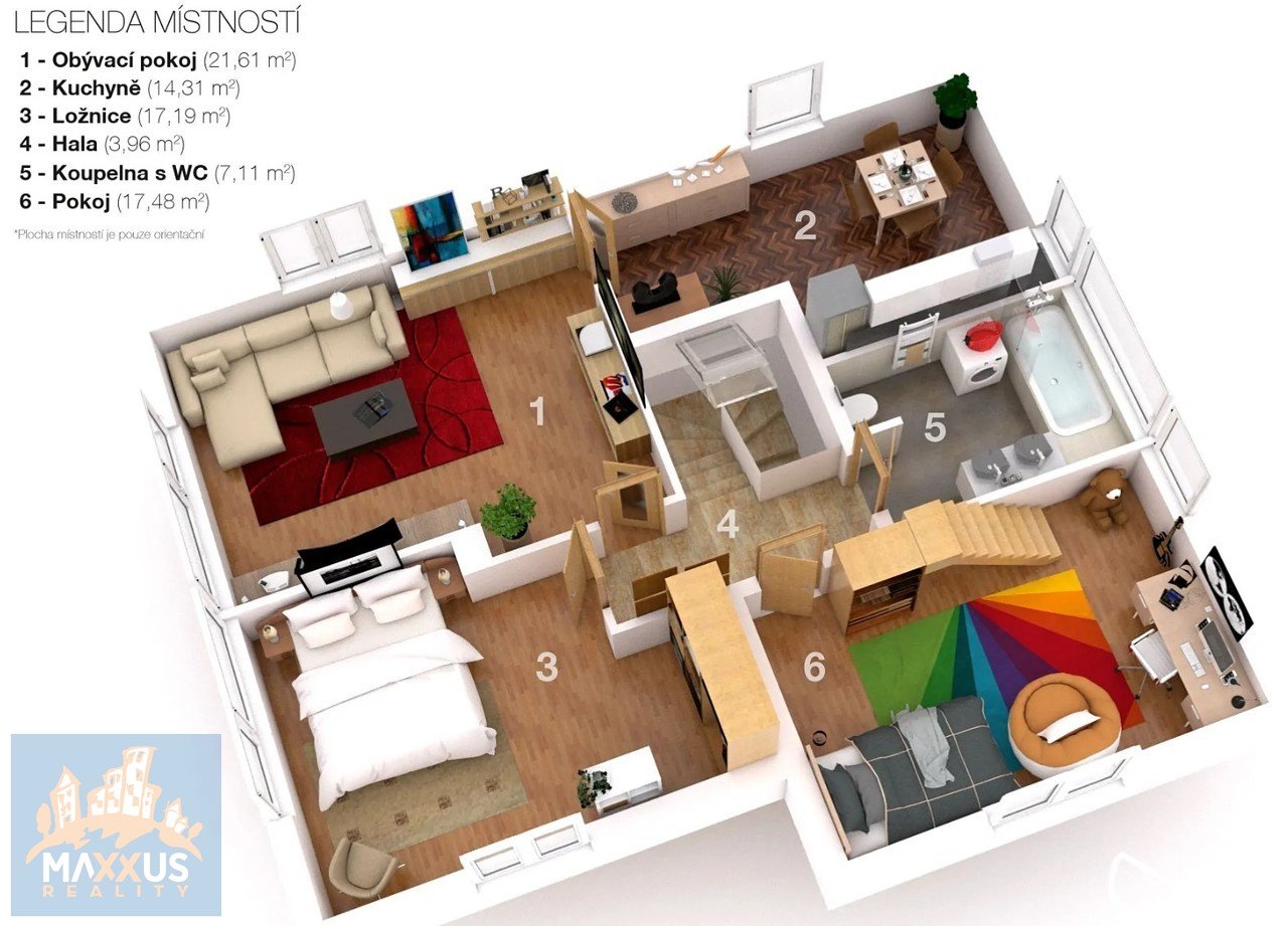 Dispozice bytu: ložnice (15 m2), dětský pokoj (16 m2) + galerie se sníženým stropem (16 m2), obývací pokoj (21 m2), kuchyně (14 m2), koupelna s WC (7 m2), vstupní hala (8,5 m2), schodiště s chodbou (10 m2).
