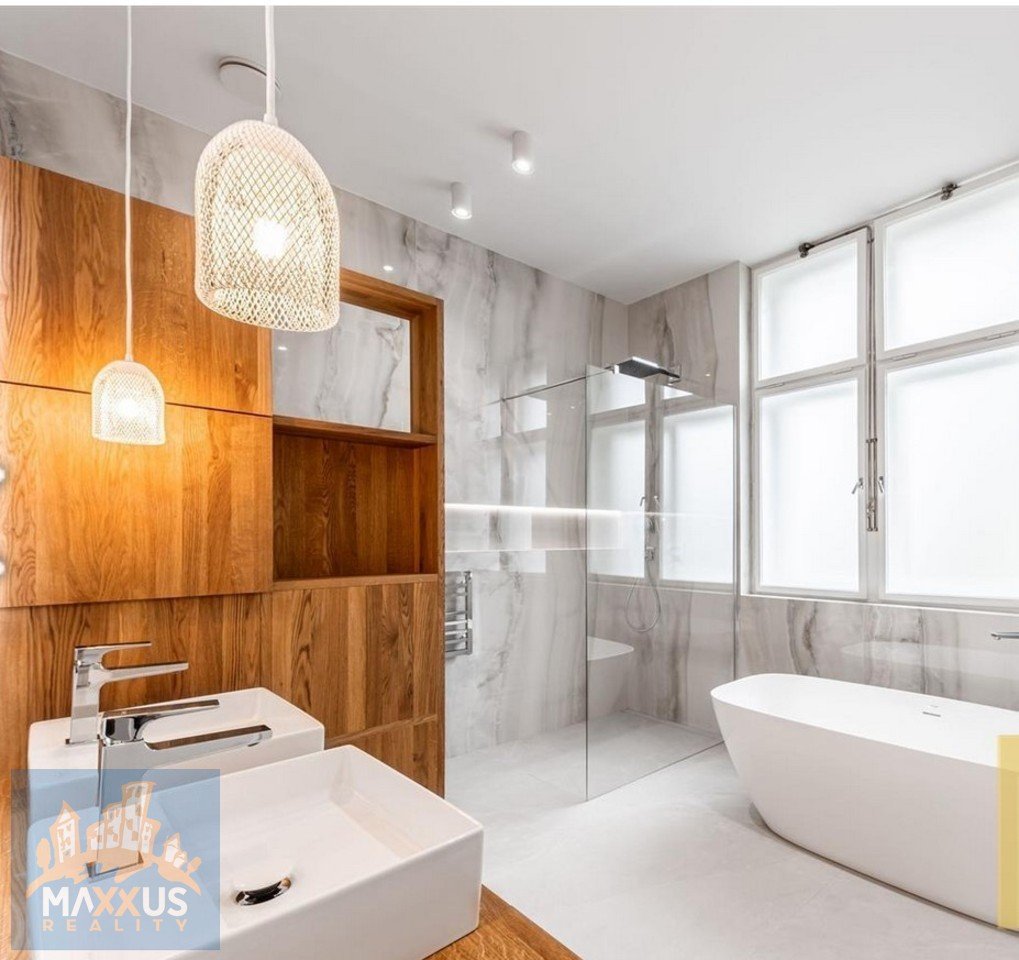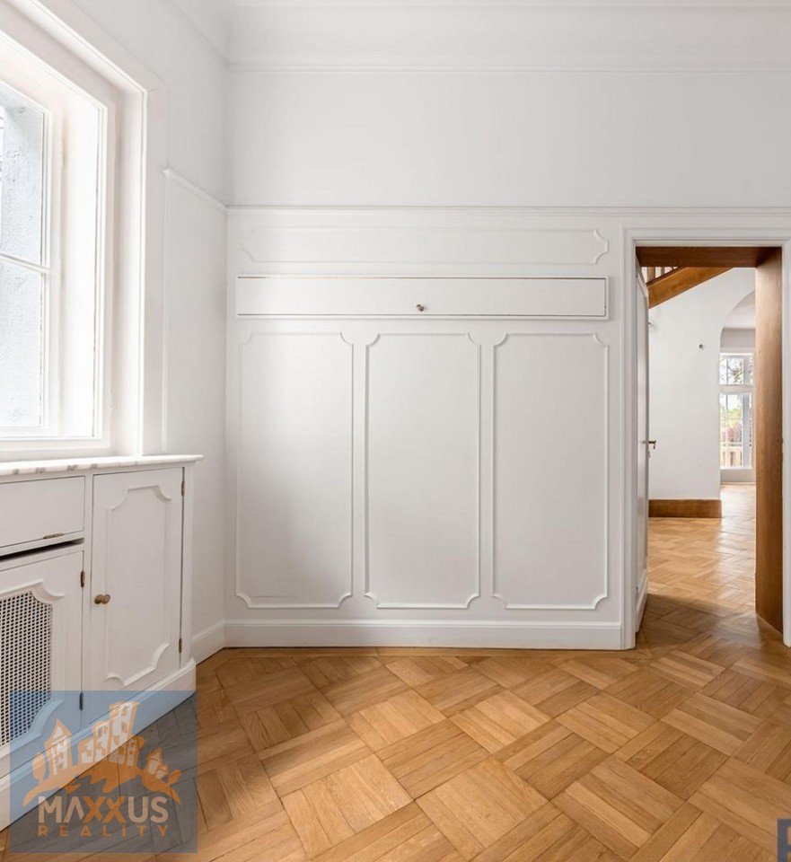 The ground floor of this luxury property consists of an entrance hall, a reception hall with an original staircase and a walk-through cloakroom, a spacious living room, a dining room and a separate kitchen, a study, a winter garden, and a separate toilet. The terrace is accessible from both the dining room and the hall and living room. On the first floor, you will find the master bedroom with a private bathroom equipped with a bathtub, shower, two sinks, and a toilet, a second bedroom with access to the balcony, two more bedrooms, a separate bathroom with a shower, two sinks, a bidet, and a toilet with access to the balcony. The second floor has a hallway, a master bedroom with a private bathroom, three additional bedrooms, a separate bathroom, and a practical walk-in closet. The basement of the house has a wine cellar, laundry room, storage space, and technical facilities (boiler room, storage room). The house is equipped with a kitchen with Miele appliances (including a refrigerator with freezer, ceramic hob, extractor hood, built-in electric and microwave ovens), built-in solid wood wardrobes, stucco and storage space, Villeroy & Boch and Hansgrohe sanitary ware, gas boiler, connections for washing machine and dryer, French windows, alarm system, renovated original wooden surfaces and floors, Italian large-format tiles and wall tiles. The villa has a Loxone Smart Home intelligent home control system (controlled via smartphone), underfloor heating in the kitchen and bathrooms, WiFi 6, a camera system, and a laundry chute. The property offers parking and electric car charging.